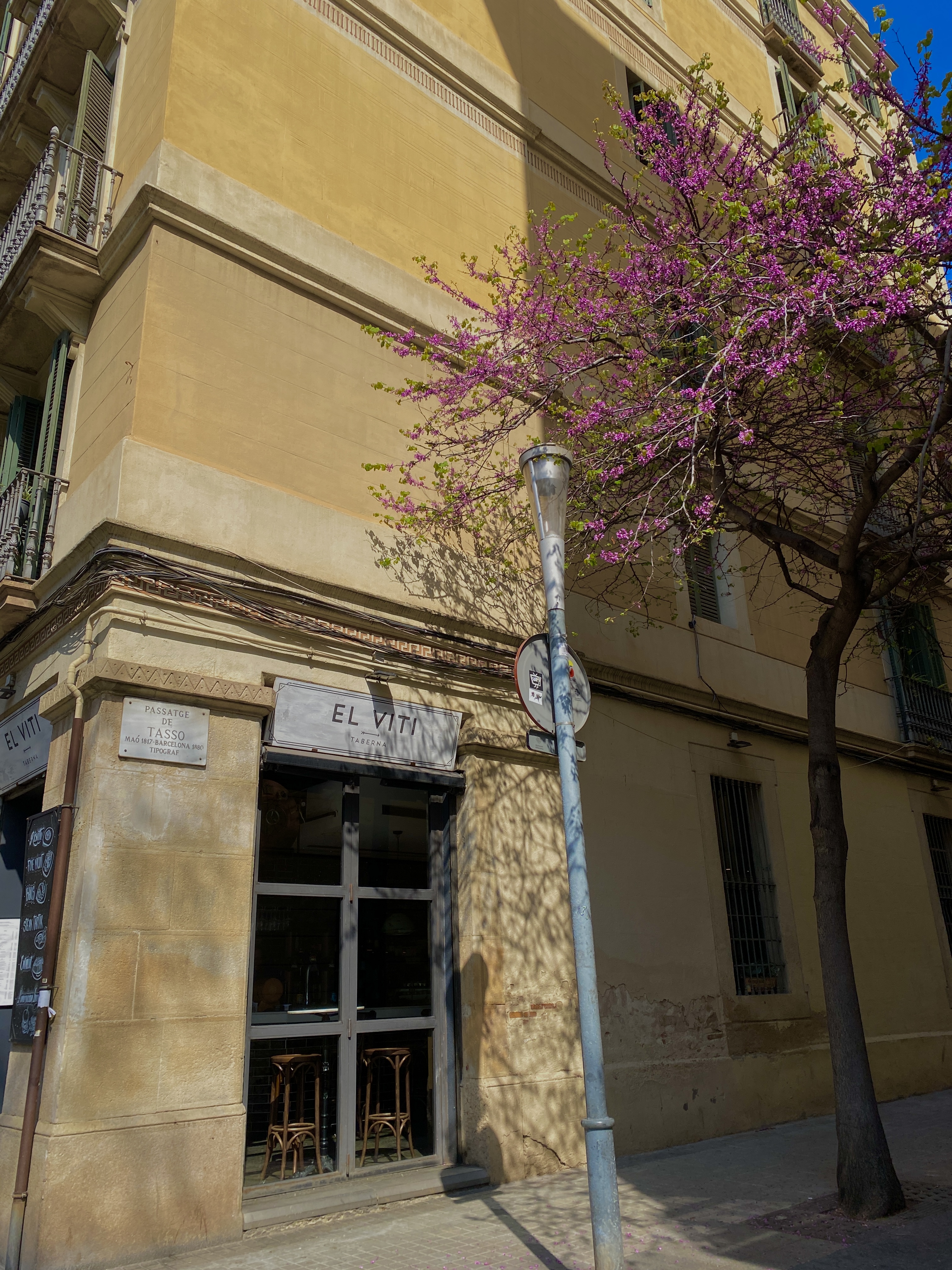 Vila de Gràcia is the neighbourhood I keep coming back to in my head. Quieter, more residential. The kind of place where a flowering tree on a street corner feels like it was placed there on purpose. Small squares, locals sitting outside, a taberna with the door open. No particular reason to be there other than the fact that it is exactly the right place to be.